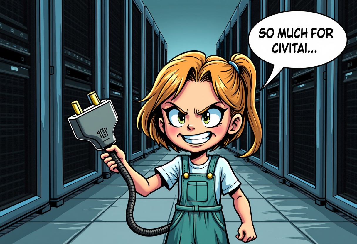 Prompt A young girl with an evil grin, who is looking at the camera and holding a large electrical plug in her hand, with the other end attached to a server. In the background is an industrial server park filled with servers that are now unplugged, without power, and completely dark. Drawn in the style of a comic book or graphic novel. The girl is saying in a speech bubble: "SO MUCH FOR CIVITAI..."
