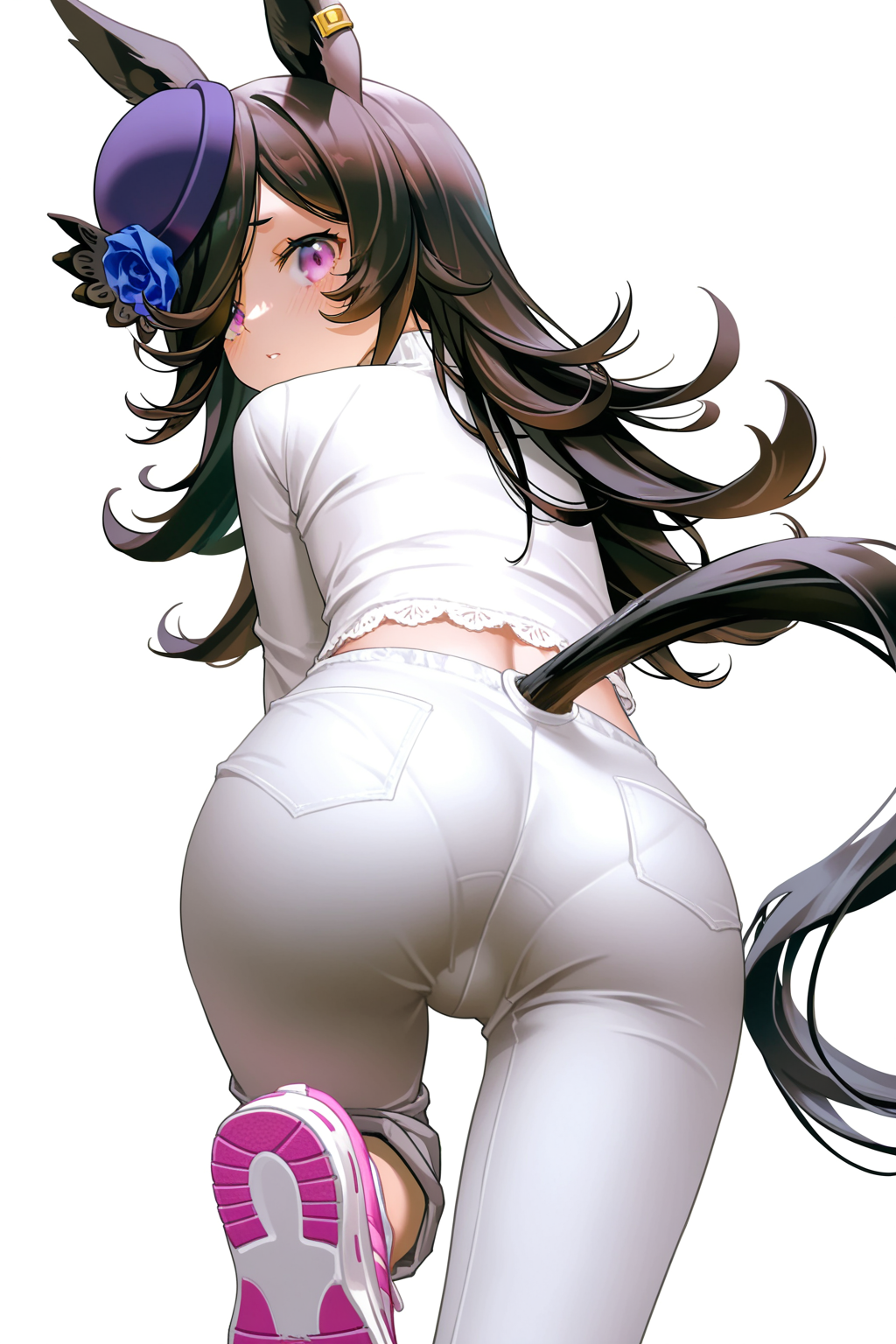 Prompt | 1girl, rice shower \(umamusume\), chen bin, yoneyama mai, [as109|fkey], [sweetonedollar:11], agm, alternate costume, plum turtleneck, lace trim, ghost white pants rolled up, earclip, leg up, ass focus, close-up shot, best quality, masterpiece, very awa, absurdes, pant, pink footwear, tail, shirt, long sleeves, simple background, pantylines, ass, tilted headwear, lace-trimmed shirt, white shirt, pink eyes, looking at viewer, short eyebrows, from behind, black hair, hat ornament, tail through clothes, absurdesu x, hair over one eye, purple headwear, midriff peek, shoes, solo, pants rolled up, white background, long hair, looking back |